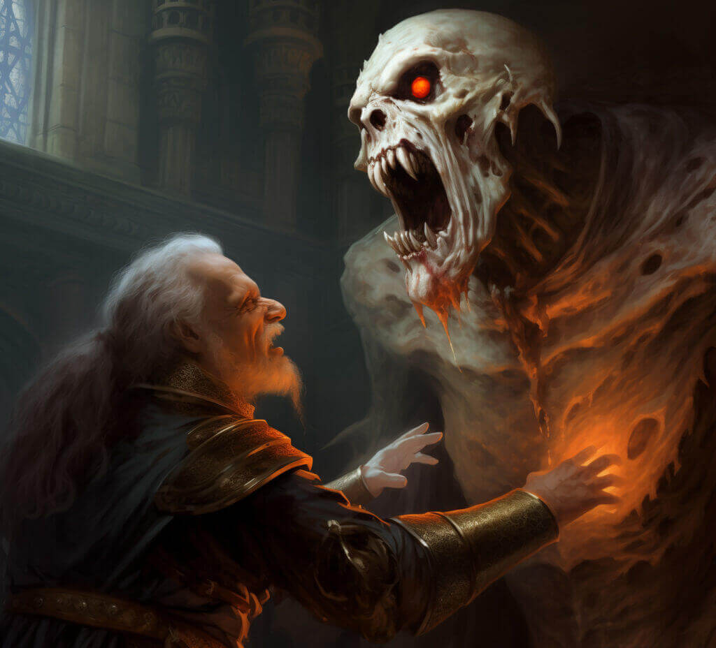 The second sentinel drops his guard for a fraction of a second to glance at the first guard. What he sees in the place of the guard fills him with dread and terror. Standing before him is a Thing, composed of shadows and darkness, almost humanoid in form, but translucent like black murky water. Thousands of impossibly white teeth jut from a mouth like ebony, set below two eyes, glowing red like the pits of hell themselves, swirling maelstroms of hate and suffering ready and hungry to devour. The guard has chance to utter the first split-second of a single, terrified horrific scream as a hundred scintillating tentacles emerge from the ravenous maw, pulling him face-first into the mouth of the Creature, and drain him of his very essence, and consuming in the most painful, terrible and horrific way for any mortal creature to end its life…